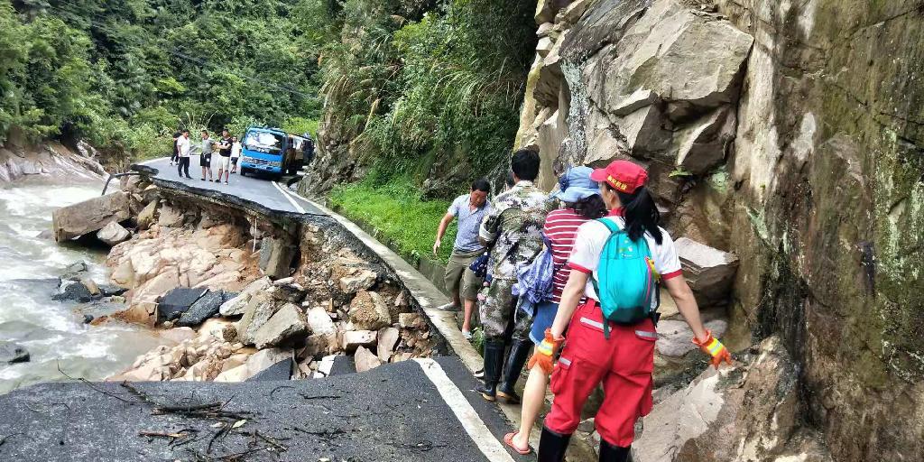 步行救援龙岗受困人员。8月11日上午8点40分,接到龙岗临时救援指挥中心指令,龙井桥大九岭村有老人受伤,目前伤势不明。接到指令后,正在待命的临安红十字北斗救援队派出6名队员,拿着担架、绳索、救生衣、急救药品等赶赴现场进行救援。当车辆开到龙井桥村村口后,道路沿线有几处塌方,交通中断,这里距离受伤老人所在村还有6、7公里路程,救援队一行扛着救援工具步行进入。目前已经成功转移出来1名受伤老人,两名小女孩、一名妇女和14名游客。