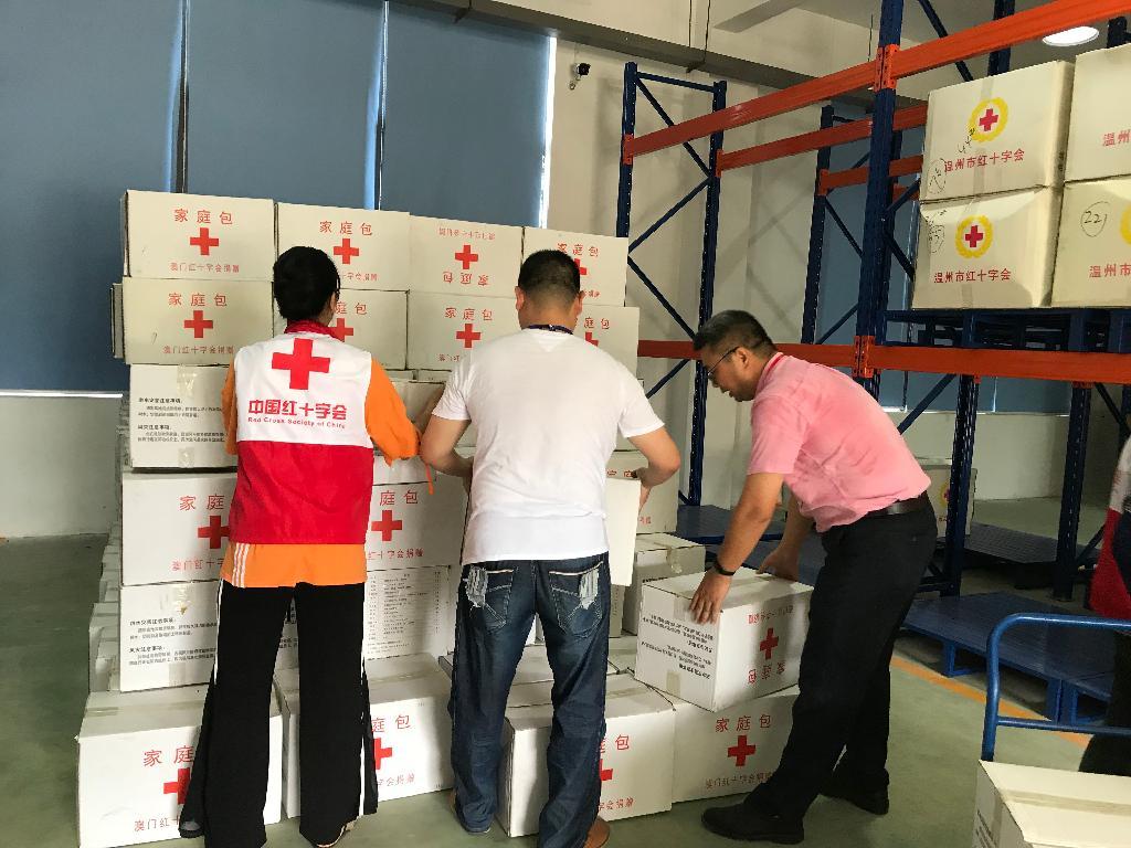 市红十字会党组书记岑慎键、常务副会长卢月丽等人全程参与了这批救灾物资的卸货、转运、交接等工作。在乐清市龙西乡龙西学校临时救灾点,他们与乐清市红十字会工作人员一起完成救灾物资转交工作。