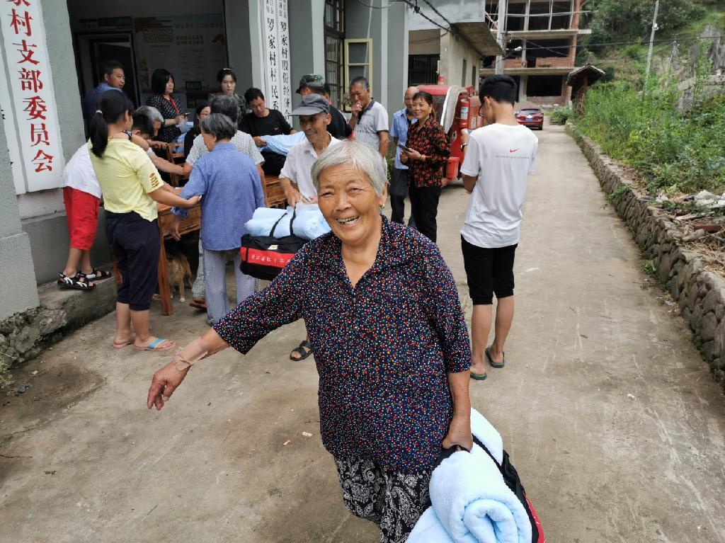 7月19日上午,在浦江县檀溪镇罗家村文化大礼堂外,接到通知的村民们前来有序领取救灾物资,这批物资来自浙江省红十字会。现场县、镇红十字会及村干部们仔细核对名单,发放物资。领取家庭包和毛巾毯等救助物资的大伯大妈们,感激地说:“这些物资现在对我们来说太有用了,感谢党和政府,感谢红十字会对我们的关心!”