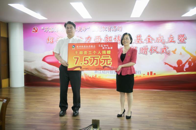 在纪念“建党”98周年之际,为进一步展现广大党员干部先锋模范作用,弘扬奉献服务意识,强化使命担当,引领社会各界推动精准扶贫、共享发展成果,7月1日,“绍兴市助力西部博爱基金成立暨恒信银行等现场捐赠仪式”在绍兴恒信合作银行举行,来自区、县(市)爱心捐赠企业、红十字会有关领导以及恒信银行员工代表近百人参加活动。市红十字会党组书记、常务副会长郑杰,绍兴恒信银行董事长钱荷根出席捐赠仪式。