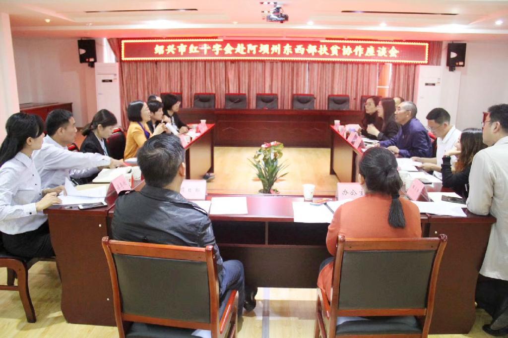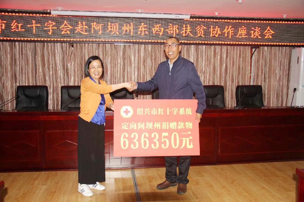 在阿坝州红十字会会议室,两地红十字会举行了对口帮扶工作座谈会。州红十字会党组书记、常务副会长更培介绍当地红十字会基本情况并感谢绍兴的帮扶。郑杰介绍了绍兴红十字会系统情况及“助力西部”工作开展情况和本次对接事项。马尔康、小金、金川三县(市)红十字会和州妇计中心负责人分别与绍兴市各有关区(市、县)红十字会负责人就当地医疗(含优生优育类)、助学支教、“三救三献”领域现状及合作需求进行了面对面深入、全面地座谈交流与和磋商对接。会上,还举行了现场捐赠仪式,此次,绍兴市红十字系统在爱心人士和企业的支持下给阿坝州带去了63.635万元款物。