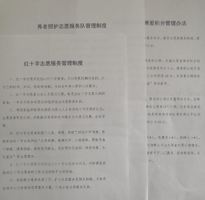 一是建立志愿服务管理制度。制定出台《红十字志愿服务管理制度》和《养老照护志愿服务队管理制度》,明确红十字志愿者招募、登记、服务范围和志愿队伍服务、管理等要求。