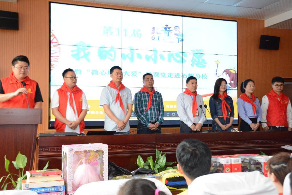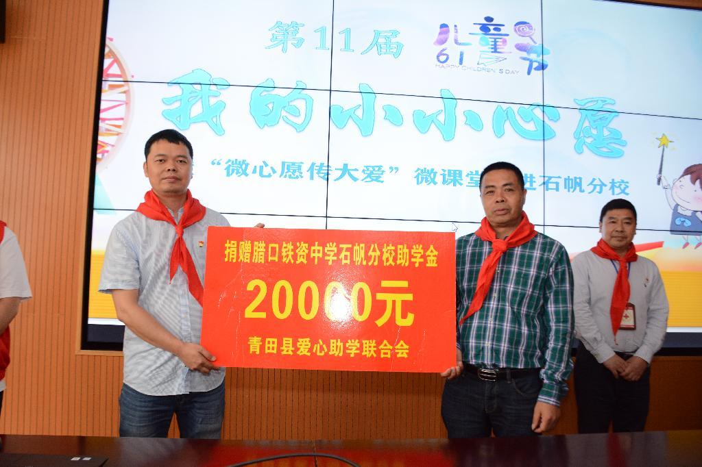 5月31日上午,由青田县红十字会、共青团青田县委、青田传媒集团、青田县图书馆、青田县爱心助学联合会、周大妈帮忙团、微心愿传大爱阳光公益协会、青田县心理健康协会、省交通集团船寮收费所联合举办的第11届六一儿童节“我的小小心愿”暨“微心愿传大爱”微课堂走进石帆分校,志愿者们为该校61名家庭困难的小朋友送上了61份别样的六一礼物。