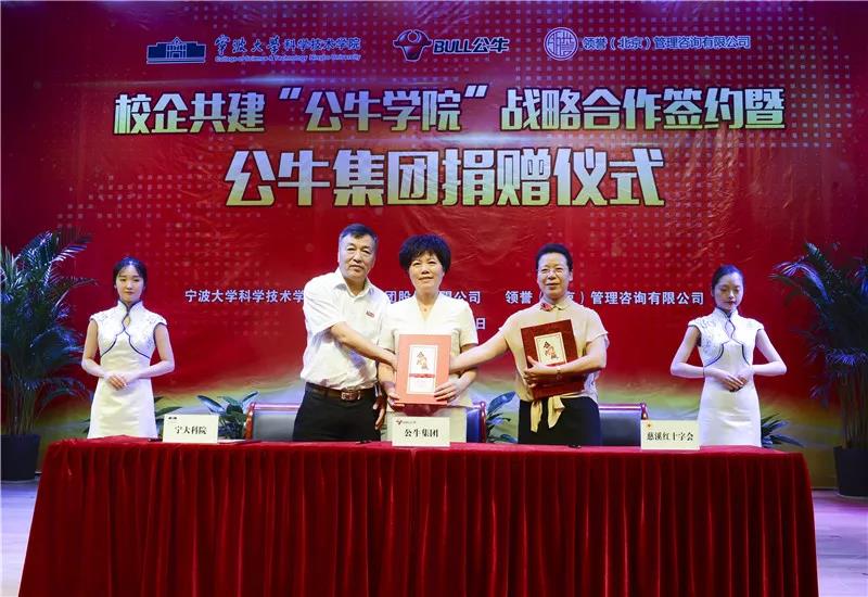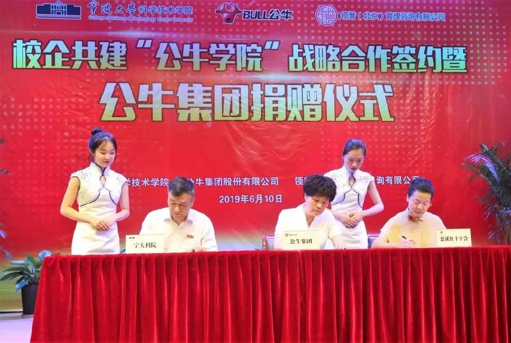 6月10日下午,校企共建“公牛学院”战略合作签约暨公牛集团捐赠仪式举行。仪式上,公牛集团与宁波大学科技学院、领誉(北京)管理咨询有限公司三方共同签订共建“公牛学院”战略合作协议。