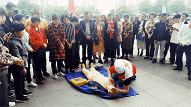 一位大叔突然捂着胸口倒地。“请让下,我是红十字救护员,我来看下!”......在快闪活动开始前,一场应急救护演练吸引行人们驻足观看。培训师在现场演示应急救护相关技巧,模拟演练救护动作,向行人传播“人人学急救,急救为人人”的现场应急救护理念。