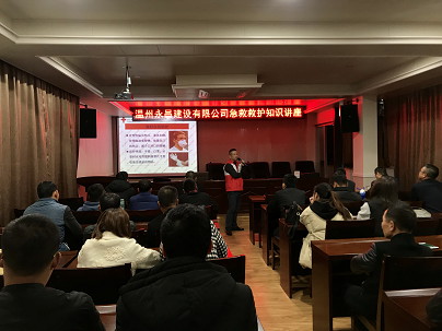 在温州永昌建设有限公司,会议室内已经人头攒动,大家都在期待讲师的讲解。因为工作的原因,永昌建设有限公司的工作人员,长期工作于工程一线,经常会碰到大大小小的各类事故,有时候又往往因为不懂急救知识而酿成大祸,所以得知今天专业的红十字会讲师将到场培训急救知识,所有人都已早早在会议室内等待。
