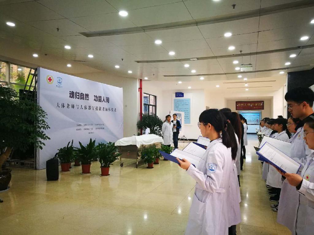 市红十字会工作人员、红十字志愿者、遗体和器官捐献者志愿者、医学院师生等上百人手捧菊花,面对大体老师肃立、默哀,依次上前献花向捐献者致敬。
