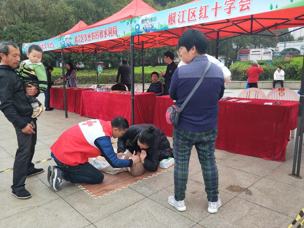 3月19日,椒江区红十字会协同台州市、椒江区两级气象局、椒江区科学技术协会、椒江区农业农村和水利局、椒江区人民防空办公室等单位,围绕“太阳、地球和天气”主题,在椒江青少年宫广场开展2019年世界气象日宣传活动。红十字志愿者为居民普及应急救护知识,发放急救宣传手册等宣传资料。