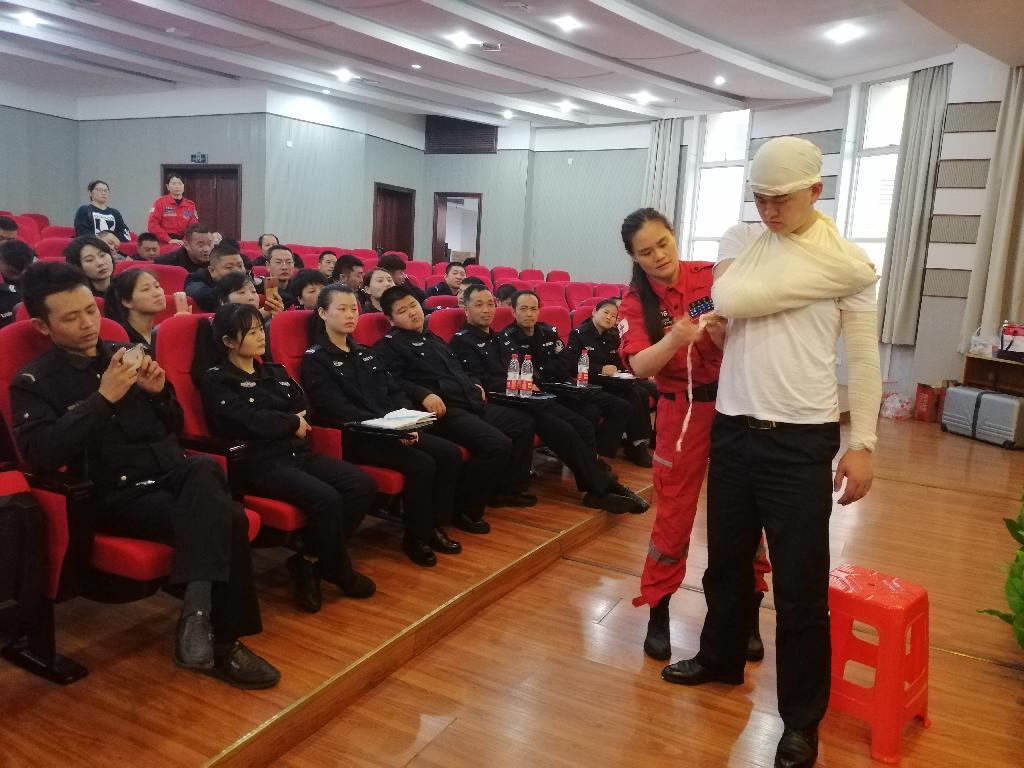 在现场,广大辅警们在救援队讲师的指导下轮流进行模拟、互相演练、积极互动,较好地掌握了心肺复苏技能、止血包扎、骨折固定等技术要领。