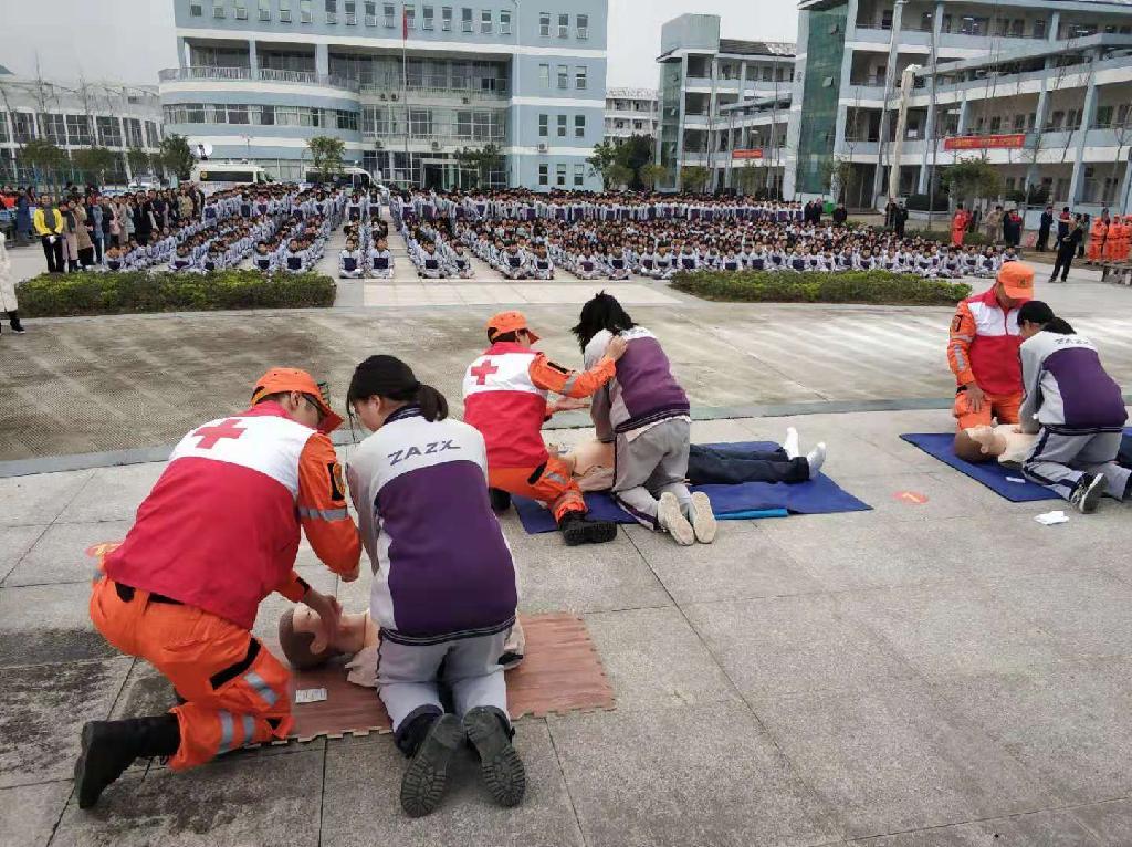 红十字救援队员现场为师生讲解演示心肺复苏急救技能和AED(自动体外除颤仪)使用方法,并邀请学生参加心肺复苏操作练习,还向全体师生发放了红十字应急救护知识宣传资料,在学校中营造了学习应急救护知识的浓厚氛围,进一步提高了广大师生的防灾避险意识和应急救护能力。
