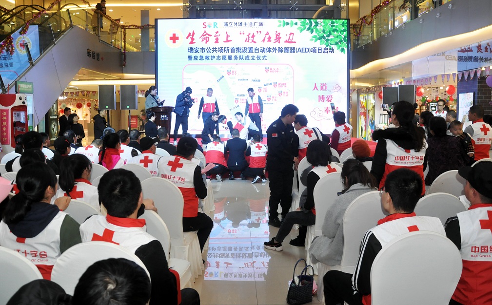 12月19日下午,瑞安市公共场所首批设置自动体外除颤器(简称AED)项目启动暨应急救护志愿服务队成立仪式在瑞立生活广场温情上演。瑞安市人民政府副市长章平、市府办副主任高泉印、市红十字会党组书记岑慎键、市文明办副主任蒋缓明、市卫计局计生协会专职副会长包志定以及首批设置AED点的代表和志愿者80多人参加了活动。仪式由市红十字会常务副会长卢月丽主持。