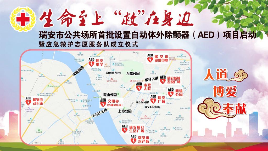 此次我市首批设置AED的10个点,分别位于瑞安市动车站、瑞安外滩健身点、瑞安水产城、市政大院、审批中心、瑞安中学、明镜公园、瑞安广场、新城吾悦广场、瑞立生活广场。市红十字会党组书记岑慎键在项目情况介绍中表示,首批自动体外除颤器的启动弥补了瑞安这一领域的空白,对于加强城市的公共安全体系建设,创造安全有序的生活环境、营商环境和社会环境具有重要的意义。同时,他还呼吁更多的单位、部门及社会力量参与进来,共襄善举,一起为健康瑞安、文明瑞安、至美瑞安建设做出应有的贡献。