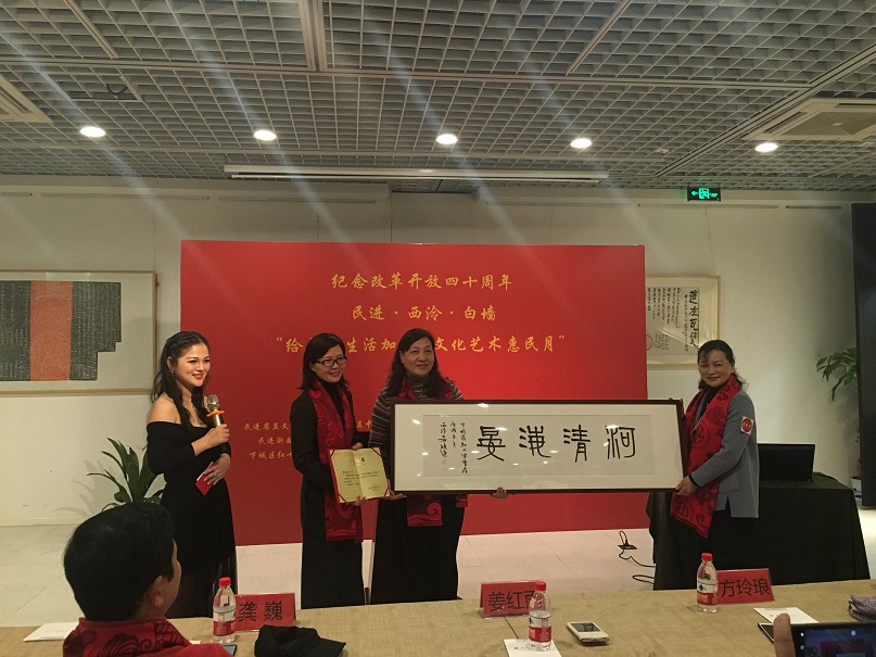 12月22日下午,由民进浙江省委会、西泠印社文化艺术发展有限公司主办,民进省直文化支部、下城区红十字会等部门联合承办的“纪念改革开放四十周年——给美好生活加油,文化艺术惠民月”启动仪式在位于西湖文化广场的西泠印社文化艺术空间举行。