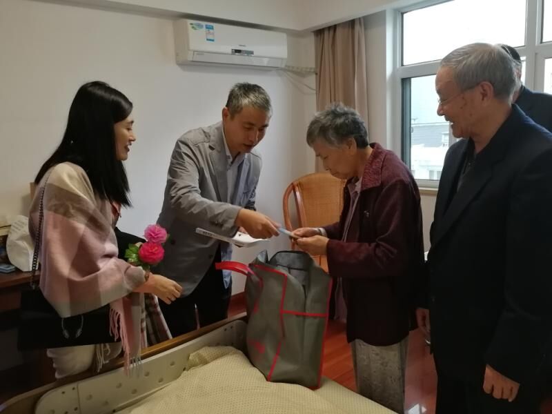 10月16日下午,重阳节前夕,宁波市红十字会党组成员、巡视员周枝法和捐赠企业宁波易中禾生物技术有限公司董事长肖艺一行来到颐乐园看望150位寿星老人,送上价值4万多元的爱心礼包。