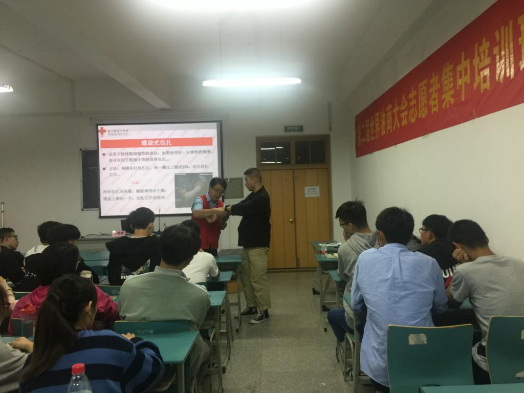 第二届世界油商大会将于10月17日至19日在舟山举行。为助力世界油商大会,10月10日晚,在浙海大东科校区活动中心211教室里,省一级救护师资俞晓明老师正在给油商大会的志愿者普及急救知识。