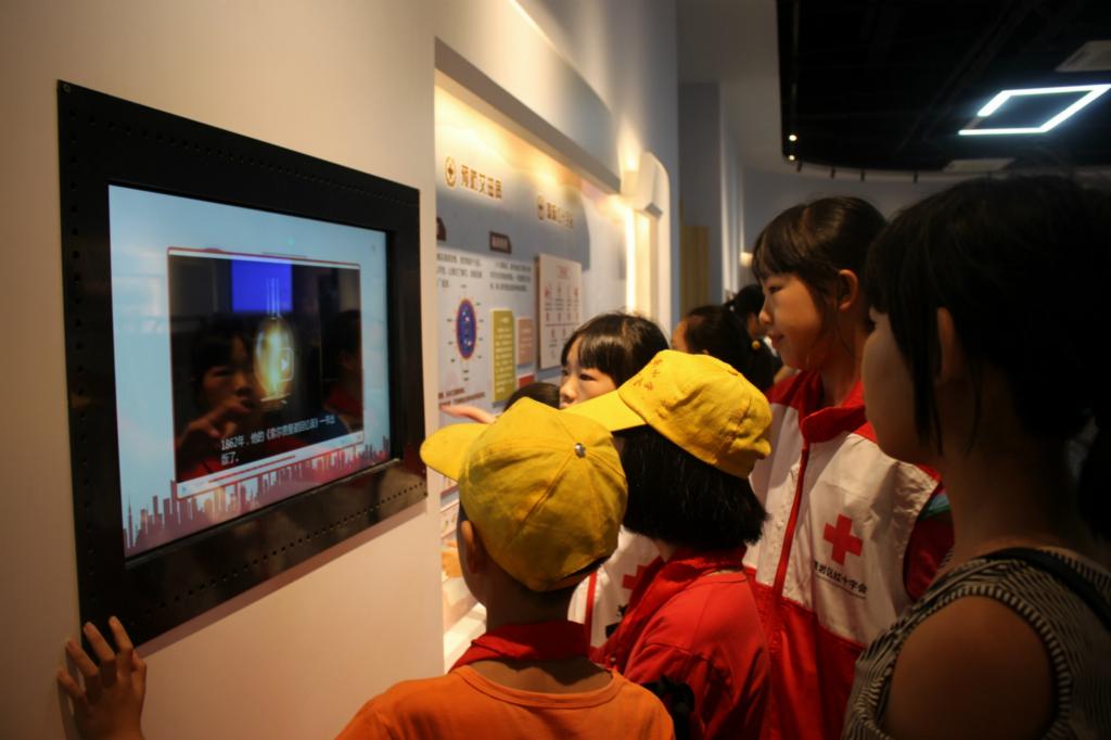 培训结束后,学生们参观了红十字生命体验馆,进一步加深了对红十字运动知识和应急救护知识的理解。学生们围在展厅的红十字展示屏前观看红十字运动视频。 “亨利•杜南先生是红十字运动的创始人,他是一个很博爱的人,我要像他学习,努力帮助更多的人。”