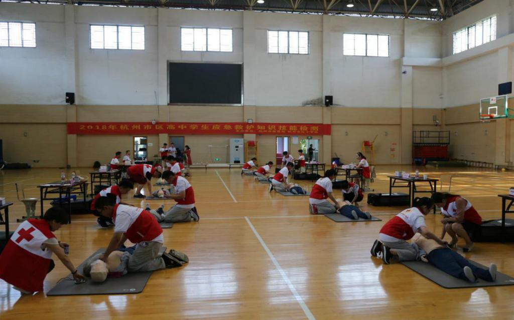 9月19日,2018年杭州市区高中学生应急救护知识技能检测在杭州十四中举行。这是杭州市红十字会第8年开展此项工作。今年有49所市区高中(包括职高)参加检测,是参加学校最多的一年,相比2011年参加学校数增长了一倍。市教育局从每个学校抽出20名高二学生(男女生各10名),在抽测一周前告知学校,并由学校从中选定男女生各5名参测。