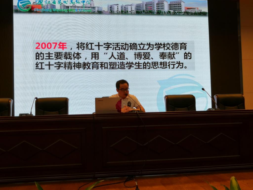 会议专门邀请了吴兴高级中学副校长莫幸华,为全体与会人员作题为《红十字德育品牌造就智慧而温暖的行者》的专题讲座,他向大家介绍了吴兴高级中学从2006年成立红十字会后将红十字活动作为学校德育特色的发展历程,详细介绍了学校如何构建“博才教育”课程体系来支持人道主义的传播,学校如何将红十字精神融入学校德育教育实践、生命教育体系、校园文化建设、社会实践活动。讲座获得了与会人员的一致好评。