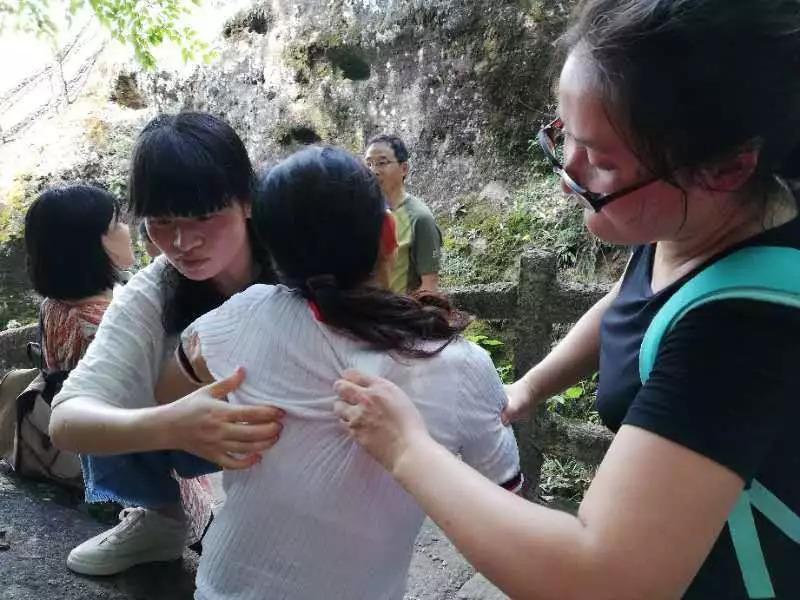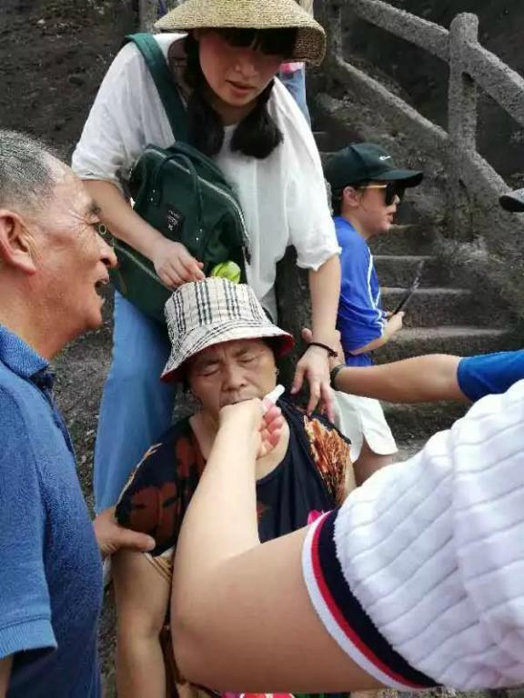 在登山途中,一位老人突然倒地面色苍白、意识模糊,她爱人焦急无助的不知所措。恰巧路过的金姣君、徐飞燕、史碧容等人立即停下脚步,上前向家属询问老人的既往史,并开始病情评估:呼吸急促、心动过速。通过观察老人情况初步判断为中暑,三名红十字救护员立即默契分工:摆好体位、清理呼吸道、通过雨伞扇子等减低体表温度、喂服水和解暑药,有条不紊的急救措施赢得了周围游客的不断点赞。5分钟后,老人意识清醒了,此时“救人三人组”并没有离开,而是一直守护在老人身边,一陪就是一个多小时,直到老人恢复体力后下山回到宾馆。虽然疗休养几年才能轮到一次,原定的行程也因为“爱管闲事”而耽搁了,但他们却觉得非常值得。参与抢救的史碧蓉说:“我是江干区红十字应急救援队的队员,也是一名护士,遇到这种情况出手相助也完全是出于下意识的本能,不管是工作时间还是休息时间,遇到需要帮助的人,我们都会该出手时就出手!”。