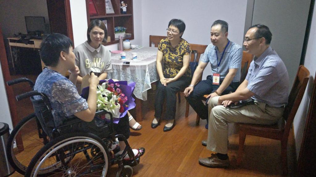 8月9日下午,杭州市红十字会会长汪华瑛、秘书长郦汀、工作人员陶一二、区红会专职副会长刘建国一行,冒着酷暑来到翠苑二区看望魔豆妈妈创业大赛选手游林冰,为她送上祝贺的鲜花,翠苑街道红十字会陪同慰问。