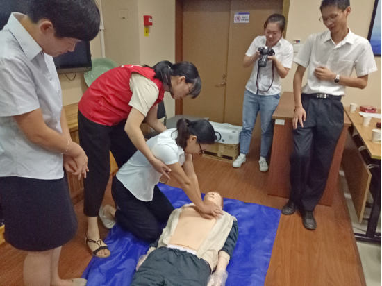 导师先是进行理论知识培训,示范急救的具体操作,随后现场指导参训人员开展实际操作演练。过程中导师对“儿童胸外按压次数多少、鼻出血的正确止血方法、搬运伤员的正确方式”等问题进行了详细阐述,并强调学好急救技能,关键时刻伸出援手。由此告诫大家要珍爱生命。(潘叶乔)