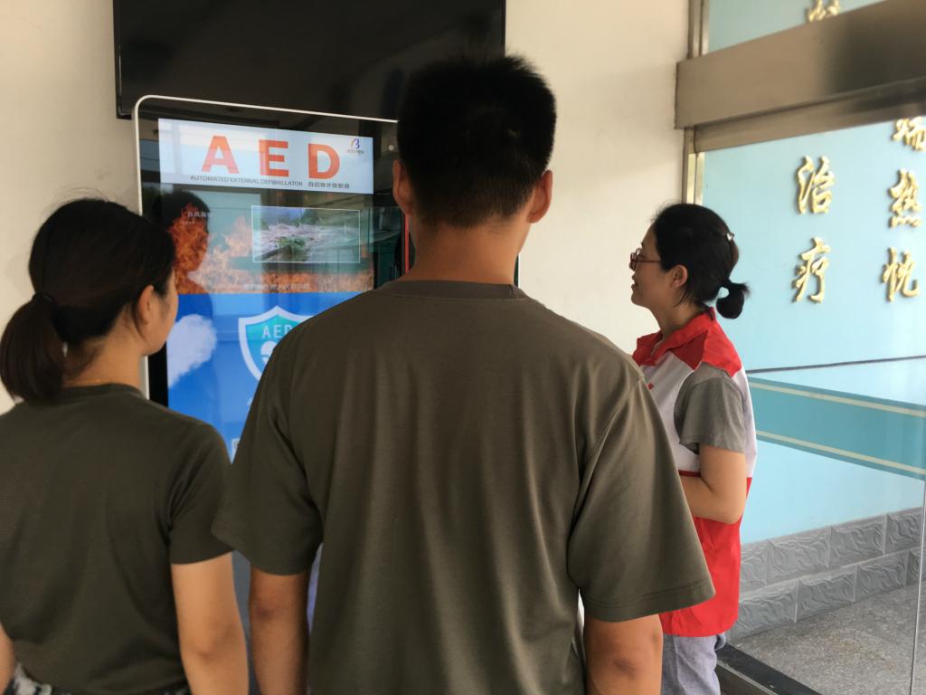 在部队医院大厅,医院负责人与红十字会工作人员一起,为医院医护人员讲解仪器的使用。医院负责人周医生说:“第一时间通过自动体外除颤联合心肺复苏术来抢救心脏骤停的患者,能大大提高心抢救成功率,也能有效保障官兵的安全。”下午,部队战士小李训练结束后回到营房,在红十字公益水站前只需手机扫描、不到10秒钟,一瓶冰镇水就取出来了。“现在的天气很热,能方便的喝到冰水的感觉特别好!”。