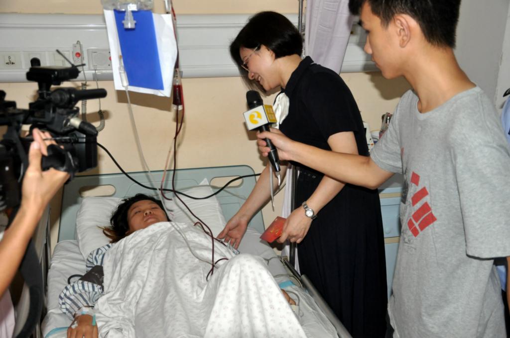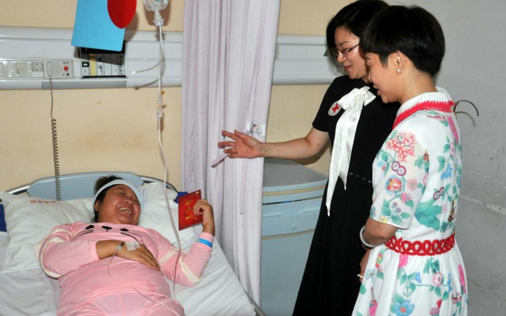 仪式之后,项目组还进行了针对高危孕产妇的慰问活动。在妇幼保健院的病房里,来自贵州普定县的陈富艳欣喜地接过了慰问金。她表示,因双胎早产,婴儿情况尚不稳定,产前、产后的医疗费用较大。她老公在一家厂里上班,收入比较有限,仅靠这微薄的收入养家糊口。今天刚好赶上了“母婴平安”项目启动,对她们夫妻俩来说简直是雪中送炭。