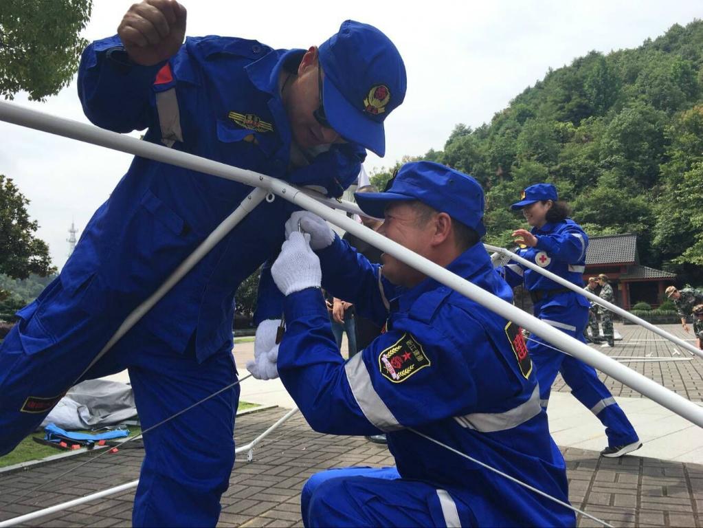 活动分三阶段进行,第一阶段为自由训练,作为最常用的救灾物资,如何迅速搭建帐篷是考验每个队员的基础项目。只见他们仔细比对物品清单,研究说明书,从开始的摸不着门道到一点一点拼接完成,终于在40分钟的摸索后完成最终的搭建。在训练的基础上,随后开展正式的竞技比拼,兵分3组原地搭建,井然有序的比赛现场,每组都分工明确,从框架搭建到帆布覆盖再到细节处理,大家均以自信且敏捷的姿态完成搭建,最快的仅用了11分钟的好成绩。现场还穿插了心肺复苏模拟练习,将实战训练进行到底。从笨手笨脚到熟能生巧,大家觉得这样的训练很有意义,通过备灾演练不仅掌握了一项专业技能,更是从中学会了团队精神,明白了分工合作的意义,更好地能够服务人民,成为生命安全的“守护者”。