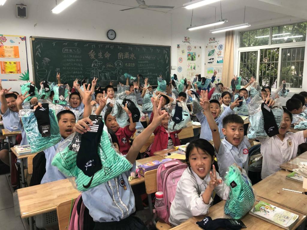 5月30日上午,满载着文具、衣服、帽子等物资的大货车缓缓驶进了位于洪塘的灵峰学校和位于甬江的甬城学校。