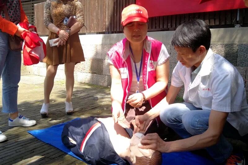 清河坊鼓楼小广场内,红十字志愿者们向市民游客发放《防范恐怖袭击与自救互救指南》宣传册,为来往群众现场讲解创伤救护四项技术、烧伤急救、心肺复苏术等紧急情况的应急处置和注意事项。 志愿者用生动风趣的语言,为现场群众详细地进行了心肺复苏术的示范演示,并手把手地指导市民学习救护技能,现场群众的学习兴致很高,大家纷纷在假人身上进行急救操练。