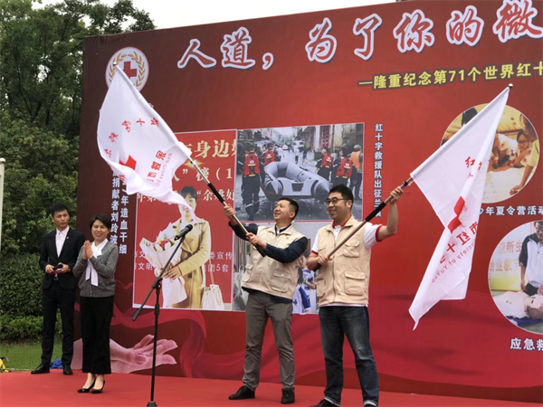 为纪念第71个“世界红十字日”,余姚市红十字会组织志愿者们在城东五彩城广场集会,以救护技能演示、现场捐赠、造血干细胞集中采样等形式,宣传今年“世界红十字日”的“人道,为了你的微笑”主题,扩大红十字会影响力。副市长、市红十字会会长王安静出席活动,并为市红十字海燕水安志愿服务队、红十字邦尔医疗服务队授旗。