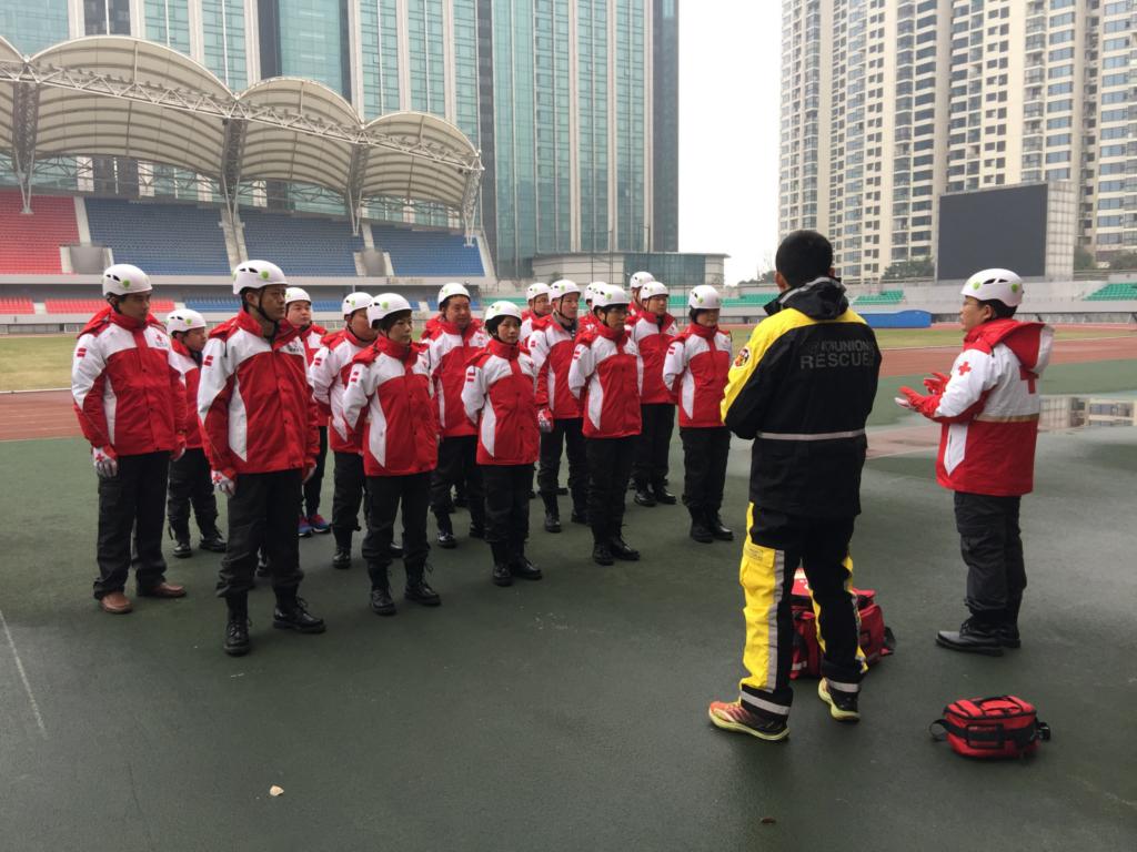 下午2时,杭城迎来了又一次的降雨、降温,但接到江干区红十字会指挥调度组指令的20名队员均克服困难、准时在江干区体育中心集结完毕。10分钟内,队员们完成了更换服装、设备领取、集合整队等准备工作,以良好的精神面貌出现在训练场,参加2018年度第一场应急救援实战演练。