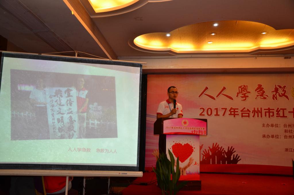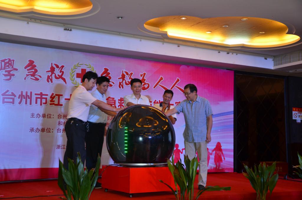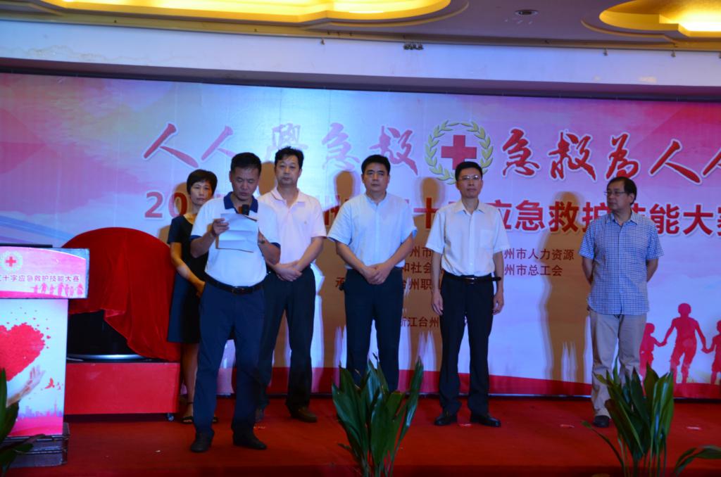 按动启动球,2017年台州市应急救护技能大赛正式开始。 台州市红十字会党组成员、专职副会长李昌建在开幕式上发言。