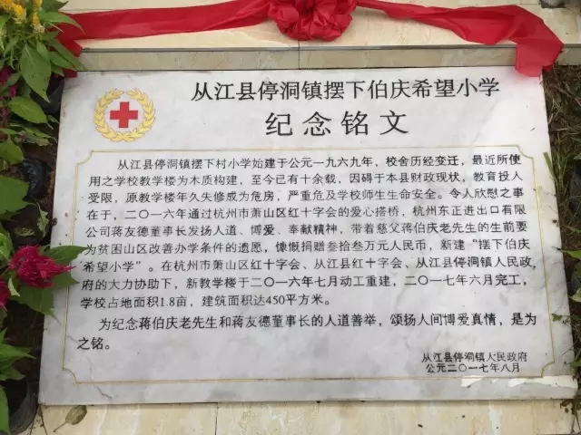9月20日上午,贵州省从江县停洞镇的摆下村一派热闹的景象,一座崭新的新校舍建成启用,她就是刚建成的“摆下伯庆希望小学”,当天来自萧山的爱心人士和全体师生一起举行了学校竣工揭牌仪式和精准扶贫助学活动。