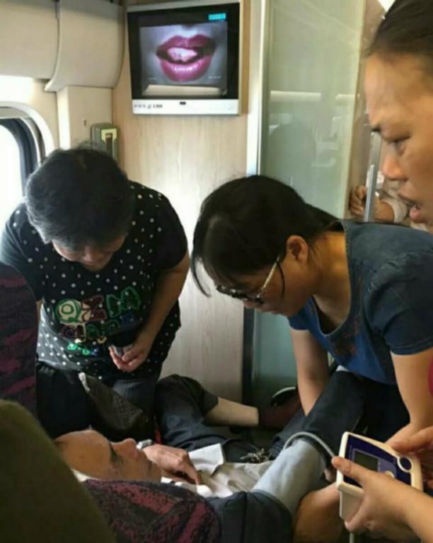 大家讨论了之后觉得很有可能脑梗塞再发加剧,同时不能排除脑出血。王雪勇向列车长要来血压计,庆幸的是血压还算平稳,老人早上也已经服用过降压药。医院的伙伴们都纷纷让座,让老人躺平,缓解症状。大家有人抬起老人的上半身,有人托着老人的腰部臀部,有人小心翼翼地支起老人的下肢,有人负责关注老人的上肢是否被压,一边喊着:“一二三,走!”齐心协力帮老人调整体位。随后又用行李箱做了个“防护栏”;考虑到喝水须防呛,又问列车长要来了吸管;大家一直和老人聊天,为老人翻身、按摩手脚。