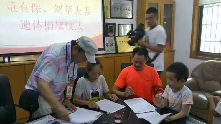 2017年5月1日凌晨,妻子刘苹病情进一步恶化、不幸因病离世,在红十字人体器官捐献协调员朱祥荣的见证下,董师傅帮助爱人刘女士完成了遗体器官捐献,刘女士的遗体组织分别捐献给浙大医学院脑库、宁波眼科医院和杭师大医学院,为眼疾患者带去了光明的希望,成为了一名伟大的“无语良师”。老董这个朴实男人重复着一句话“杭州这座城市给了他们太多的温暖,他们希望通过捐献传递光明、回报社会,感恩这人世间的大爱”。