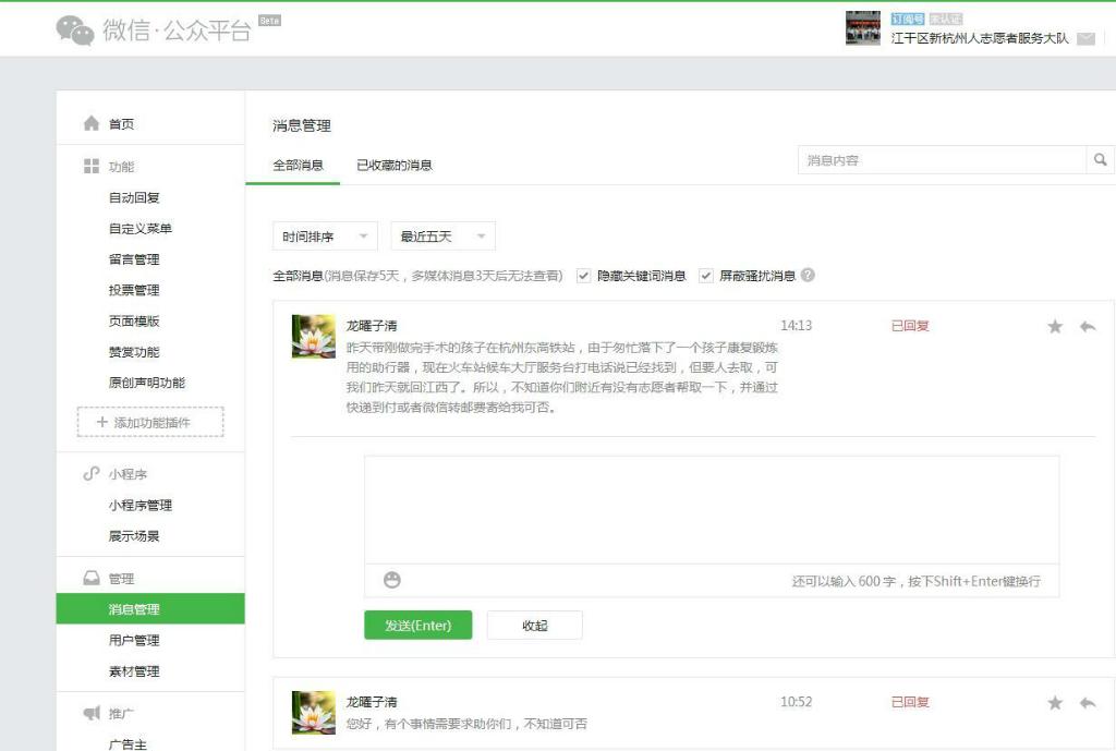 刘先生第一时间想到了求助杭州志愿者,抱着试试看的想法他通过搜索微信公众号查找到“江干区新杭州人志愿者服务队”的微信号后留言求助,志愿服务队员看到留言后第一时间在志愿服务工作交流群中发布信息。来自彭埠街道王家井社区的俞文琛当即赶到杭州活动东站,在东站志愿服务者的帮助下,找到了刘先生遗失的助行器。为了尽快将康复器械快递给刘先生,身材娇小的小俞“舍近求远”、骑着电瓶车送到了3公里外的“浙赣快递专线”,并再三关照快递小哥要小心轻放、避免重压,毕竟这是远在600公里外一名素不相识小朋友的康复希望。于是今天就有了文章开头的一幕。