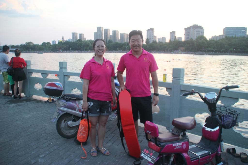 每晚的六点一到,日湖畔就会出现一批穿着玫红色红十字志愿服,背着救生浮标的的人员。他们就是江北区红十字水上救援分队的志愿者们。去年入夏以来,每到傍晚的六点到八点,队员们分组前来日湖边当义务巡逻员,先后劝导上千人次在日湖游泳,在他们巡逻时段,未发生一起溺水事件,被大家称为“日湖边的守护神”。今年,18名队员们带着冲锋舟、救生浮标、救生绳、救生圈等物品,又再次来到了日湖边,开始了新一年的执守。此次“守护”行动将从7月份开始一直持续到9月底。