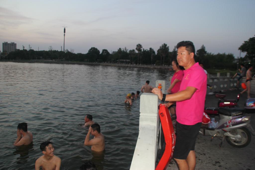 夜幕逐渐开始降临,队长刘青松匆匆从单位赶来,来不及吃饭,就穿上志愿者服装,高举着喇叭开始了安全宣讲。这时,一位年轻的爸爸正准备带着孩子下湖游泳,队员们赶紧上前劝解:“这里水深较深,比较危险,可以带着孩子去对岸的湖滨黄金沙滩区玩水。”他们一边来来回回不停地劝导提醒并讲解着防溺水知识,一边猎鹰般的双目不时注视着湖面,一旦发生险情,他们将第一时间展开救援。
