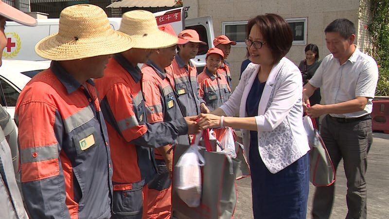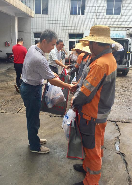 28日上午,市红十字会党组书记方燕带队与“国医堂宁波市红十字博爱直通车”项目志愿者们,先后到鄞州区百丈环卫所与兴宁环卫所,为坚守在岗位上的一线环卫工人送上了红十字会慰问品及风油精、藿香正气水、菊花茶、矿泉水等消暑清凉用品和生活用品,环卫工人们深受感动。他们说,红十字会每年都来看望我们,为我们送来清凉和关爱。他们还说,为宁波的清洁美丽是我们的工作职责,付出点辛劳和汗水是应该的。