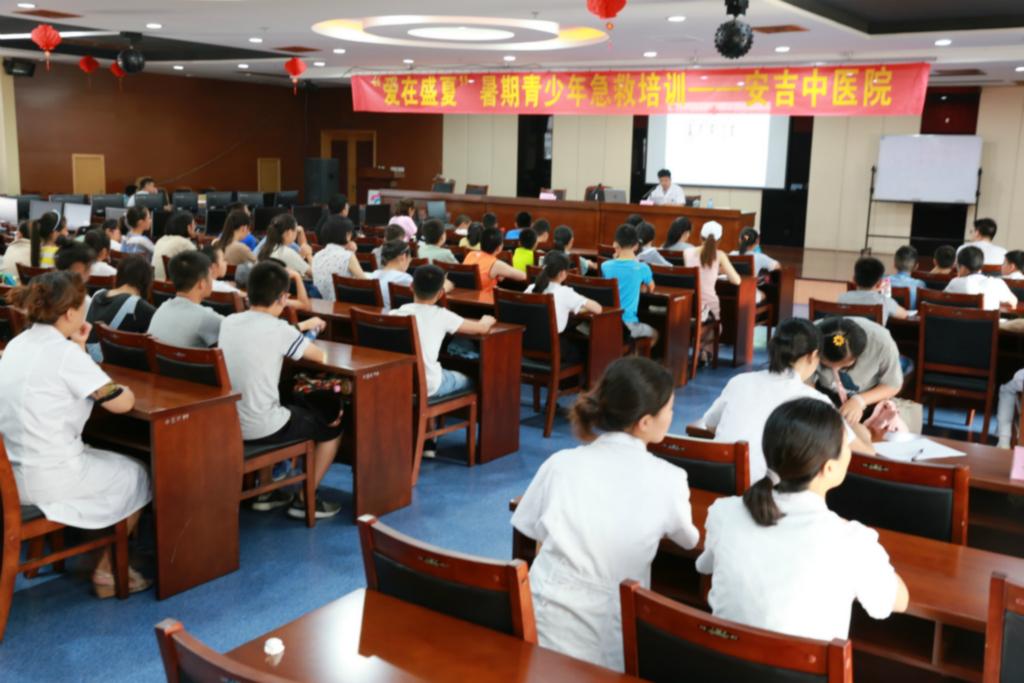 为提高青少年应急避险和自助互救能力,安吉县中医院红十字会、健教科、工会等联合策划举办了这期“爱在盛夏”暑期青少年急救培训活动,培训对象为年满10-22周岁的本院职工子女和其他学生,培训时间是一天。活动通知发出后,原定50人的培训报名人数达到84人,除了青少年,部分成人及年龄未达到报名要求的孩子也由家长带着来旁听。培训内容包括创伤救护的止血包扎、烫伤的现场处理、中暑及溺水的现场急救、气道异物梗阻处理和心肺复苏以及艾滋病预防等。