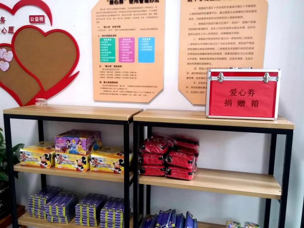 “博爱超市”是红十字会组织在社区开展红十字募捐和人道救助服务的重要平台,超市通过接受社会捐赠和已有的救助物资,为困难群体提供应急帮扶和人道救助服务。博爱超市救助对象为五保户、低保户、困难户及确有困难的普通群众,由本人向所在服务站提出申请,经所在服务站相关工作人员审核后,到博爱超市领取。目前社区的救助对象可每月前往该超市免费领取一次救助物资。