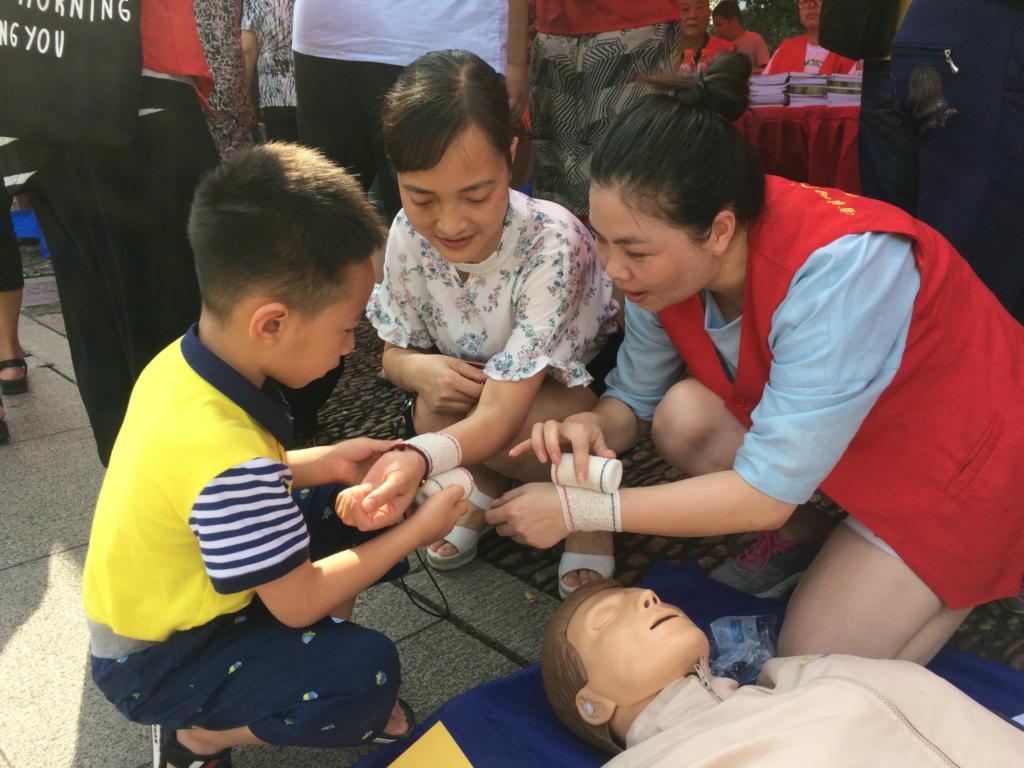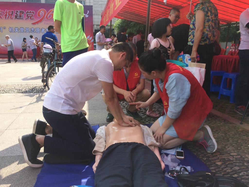 6月30日,建党96周年来临之际,永嘉市红十字会机关党员志愿者邀请应急救护师资一起前往县大会堂广场参加“红七月服务月”机关党员志愿者集中服务活动。 尽管天气炎热,但仍然挡不住市民与志愿者们的热情,活动现场人头攒动,好不热闹。活动中,我会党员志愿者为过往群众发放应急救护知识手册,宣传“急救掌上学堂”。并邀请应急救护师资为市民进行心肺复苏、包扎等急救知识的现场教学。不 少过往群众都前来体验学习,并表示这次学到的急救知识不仅实用,在关键时刻更是救人一命的重要技能。