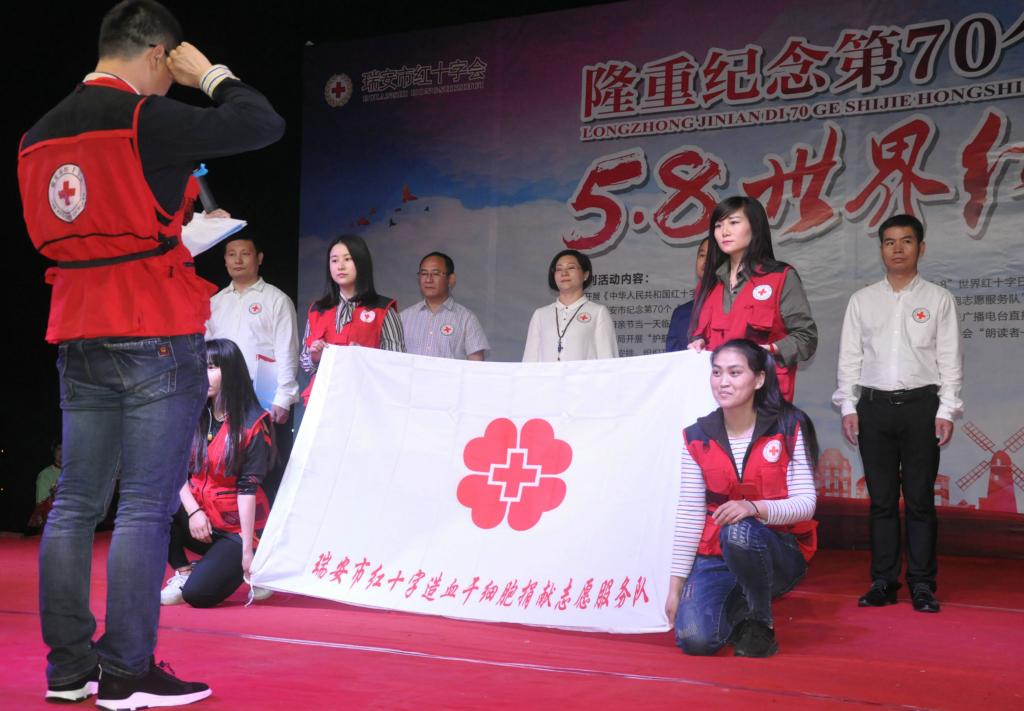 5月8日是红十字会发展史上的特殊日子,为了纪念红十字运动的创始人——亨利•杜南先生为人类和平进步事业做出的伟大功绩,红十字国际联合会将杜南先生的生日——5月8日命名为世界红十字日。每年的这个时候,世界各地都会不约而同地举办各种形式的活动来纪念这个特殊的日子,来弘扬人道主义精神,促进人类和平进步事业的发展。 今年是第70个“5.8”世界红十字日,我市红十字会早早发动,精心策划了为期一周的《中华人民共和国红十字会法》图片巡展、“5.8”世界红十字日广场大型主题宣传和志愿服务、举行“造血干细胞志愿服务队”成立仪式、主题义演、开展红十字“走进广播电台直播间”、联合体育局开展“护航” 徒步越野赛、组织救护技能下乡等九项活动。 5月7日一早, “博爱周”活动正式拉开序幕。早上7点,玉海广场活动现场便布置完成。红十字博爱艺术团的志愿者敲起了腰鼓,顿时吸引了大批的市民眼球。现场我市红十字制作的展板也吸引了不少市驻足观看,尤其是新修订的《中华人民共和国红十字会法》展板前,吸引了大批市民。现场,红十字会救护讲师向市民普及救护知识,很多市民积极参与,体验胸外按压和人工呼吸。义诊队伍依然是最受欢迎的项目,市民不约而同地排起了长龙。在人体器官(遗体)捐献台前,市民徐女士这个有纪念意义的日子里,在登记表上签下了自己的名字。活动当天,刚好是志愿者贾建东献血20周年纪念日,他拎起衣袖,参与了无偿献血。学校红十字青少年也积极参与,并与市红十字会领导合影留念。 下午,瑞安市红十字会又马不停蹄“转战”明镜公园,举行纪念第70个“5.8”世界红十字日广场大型义演暨造血干细胞捐献志愿服务队成立仪式。市府办副主任高泉印、市文明办副主任陈福春、市红十字会副会长卢月丽、杨亭玉,市卫计局党委委员周贤国、市血站站长许方毅等领导参加了活动。 在瑞安市红十字造血干细胞捐献志愿服务队成立仪式上,瑞安市首例公务员造血干细胞捐献者陈福春作为代表发言,他以亲身经历讲述了自己捐献造血干细胞的经历、经验和感受,赢得了现场观众的阵阵掌声。市府办副主任高泉印宣布造血干细胞捐献志愿服务队成立并授旗,贾建东作为队长接旗并发表了倡议。首批46名队员穿着统一的志愿者服装,在他的带领下,庄严宣誓:尽己所能,不计报酬,用真诚的爱心和实际行动,认真践行“人道、博爱、奉献”的红十字精神,为帮助他人和服务社会贡献力量。这支队伍成立后将投身捐献造血干细胞的宣传、志愿者招募、志愿者回访、再动员、看望和陪护捐献者等志愿服务工作。同时还将参与无偿献血等其他公益活动。 随后,红十字博爱艺术团给大家呈献了精彩的文艺表演,赢得现场阵阵掌声。在节目中,还贴近本次“5.8”活动主题,宣传了新修改的《中华人民共和国红十字会》、通过“模拟救护”向大家展示了事故现场如何开展自救互救、编排了通俗的“三句半”向大家宣传我市红十字会工作。 “5.8”世界红十字纪念日,也是红十字志愿者的集结日,当天共有近百名红十字志愿者参与活动,现场充满着温馨和感动。接下来,“博爱周”活动还将持续进行。
