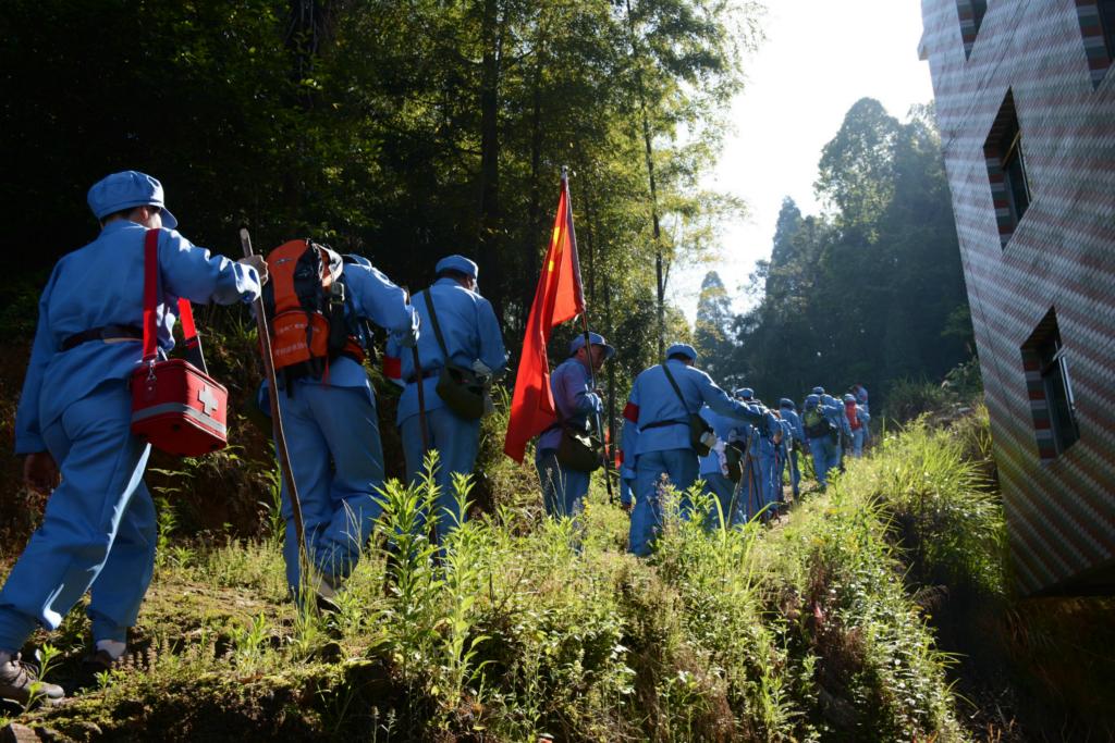 红十字应急救援队员穿着救援服,救护队员身着红军衫、头戴八角军帽、斜跨急救包、手臂上戴着红十字标志,在队伍中醒目突出。参与者们伴着初升的太阳,在乌脑头山山脚下,在救援队员引领下,开启了重走红军路的征程。