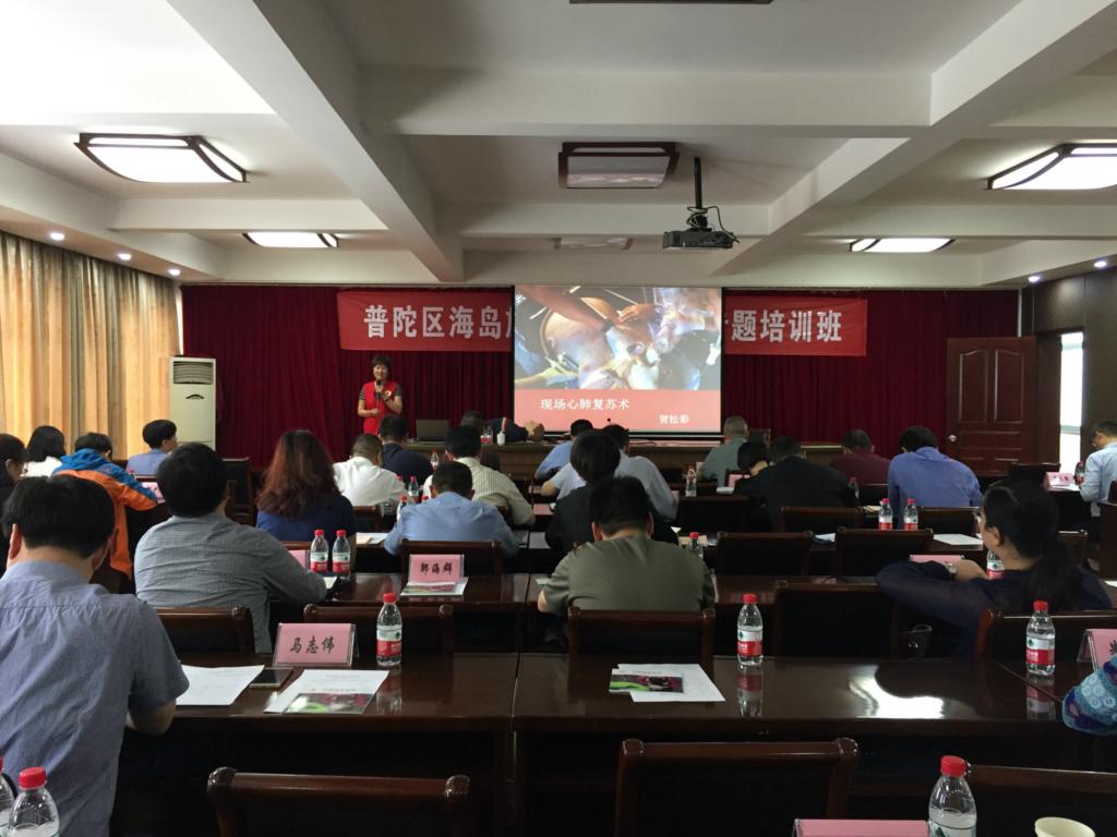 5月19日,普陀区红十字会为普陀区区委党校举办的“普陀区海岛旅游与健康产业专题培训班”的40多位学员进行应急救护知识和技能培训,这是普陀区首次将红十字应急救护知识培训列入区委党校培训课程内容。