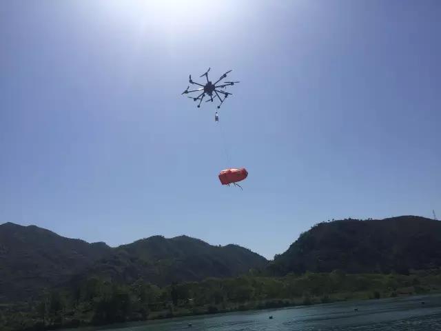 随后进行的是解救落水群众演练,海鹰救援队队员操控着一架无人机迅速升空,载着救生圈飞向落水者,并将救生圈进行准确投放,第一时间为落水者提供最及时的救援。随后,冲锋舟带着潜水员迅速赶赴落水者身边,合力将落水人员救起后交由现场的医疗组进行急救。