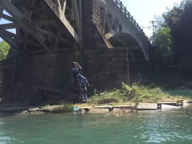 本次综合演练背景模拟受“莫兰蒂”台风影响,全县有暴雨到大暴雨,局部特大暴雨,, 严重威胁当地村民的生命财产安全。在救援受洪水围困人员环节,海鹰救援队的山地组救援人员带着救生衣从桥上速降而下,为围困群众穿上救生衣并安抚其情绪,随后3艘冲锋舟,带着救生衣迅速出发驶向营救地点,停舟、靠岸、登陆,协助群众穿好救生衣,带领群众安全转移,展示了抢险队员良好的组织能力和临场应变能力。