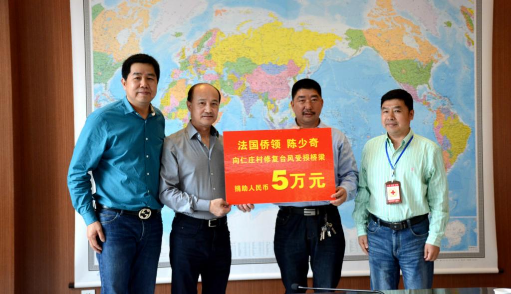 4月25日上午,欧洲青田同乡会会长、县红十字会华侨工作委员会成员陈少奇向仁庄村捐助人民币5万元,用于修复去年受台风“鲇鱼”影响而受损的桥梁。县人大华侨专委主任厉王平、县红十字会常务副会长吴树南参加了捐赠仪式。