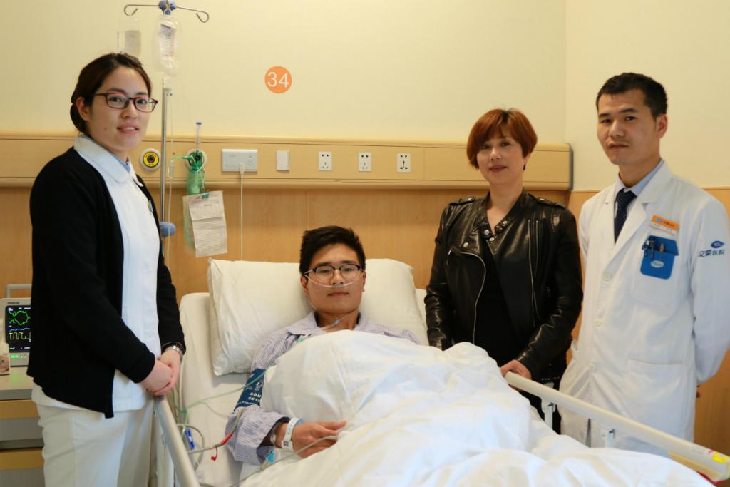 赛前东阳市红十字会为红十字救援队队员和志愿者进行现场救护培训 马拉松现场 救护现场东阳市红十字救护培训师肖世浩为小姜进行除颤 肖仕浩(右一)到病房看望小姜并和其家人合影